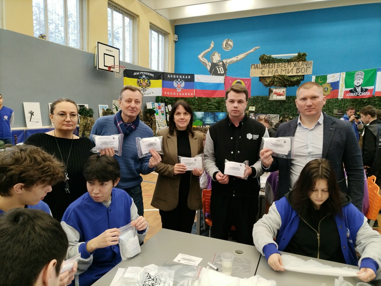 Участники акции провели сбор гигиенических наборов, написали письма и открытки для бойцов, провели мастер-класс по плетению маскировочных сетей.