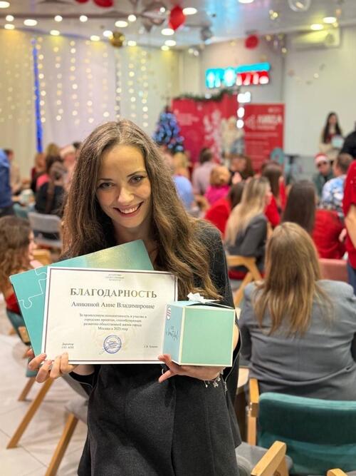 Агентство общественных проектов подвело итоги уходящего года. Депутат муниципального округа Щукино Анна Аникина была награждена благодарностью директора ГАУ «Агентство общественных проектов» Сергея Луценко за активное участие в городских проектах, способствующих развитию общественной жизни Москвы, в 2025 году.