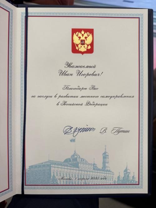 Награду Ивану Игоревичу в рамках VIII Съезда Всероссийской ассоциации развития местного самоуправления в Мастерской управления «Сенеж» вручил Председатель Комитета Совета Федерации по федеративному устройству, региональной политике, местному самоуправлению и делам Севера Анатолий Шевченко.