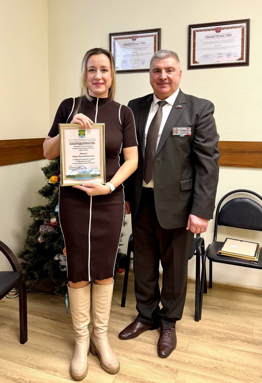 Андрей Савидов торжественно вручил благодарственные письма Московской городской Думы за вклад в реализацию социально-значимых проектов Восточного округа депутатам Даниилу Агафонову, Екатерине Мальцевой и председателю Правления РООИКС Михаилу Руеву.