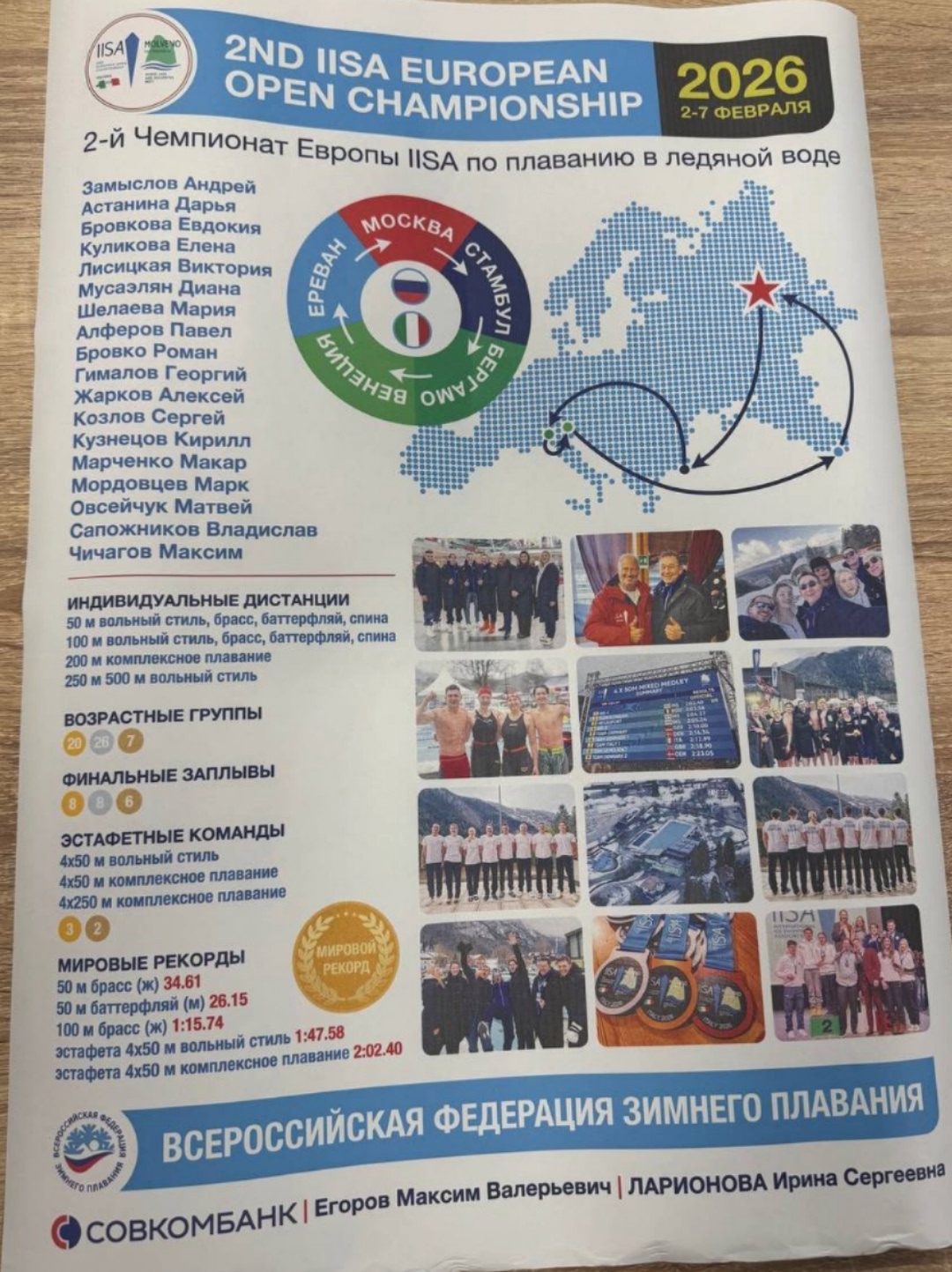 Глава муниципального округа Крылатское Максим Егоров выступил спонсором поездки сборной команды России на прошедший со 2 по 7 февраля Чемпионат Европы IISA по плаванию в ледяной воде.