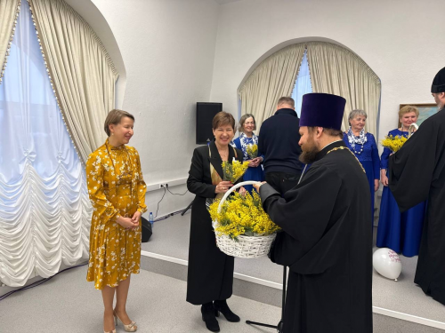 В завершение концерта мужчины вручили всем женщинам веточки мимозы как символ весны и надежды, а иерей Игорь Константинов пригласил гостей на чай с пирожками.