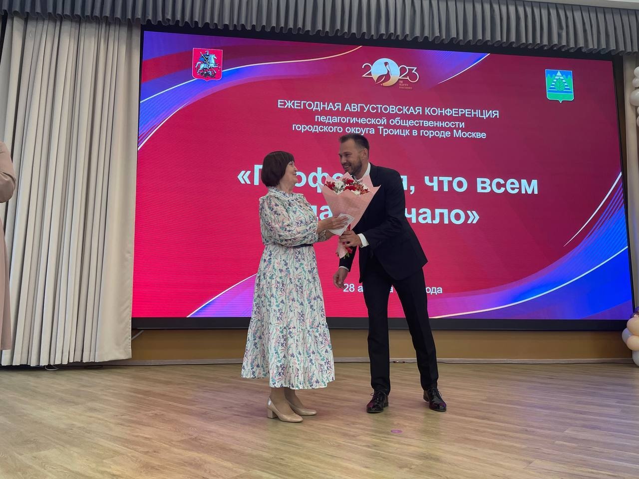 С началом нового учебного года учителей поздравили почётные гости: депутат Мосгордумы Валерий Головченко, первый заместитель префекта ТиНАО Игорь Окунев, глава городского округа Троицк Владимир Дудочкин и председатель Совета депутатов Владимир Бланк.
