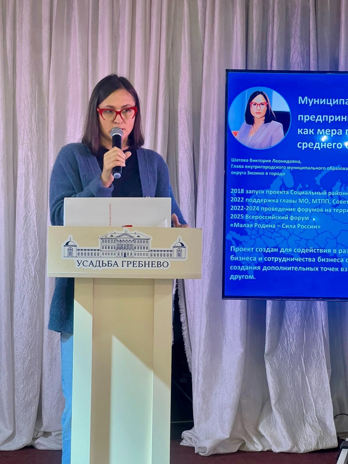 Глава муниципального округа Зюзино Виктория Шатова выступила в Усадьбе Гребнево в рамках слёта Общероссийского движения предпринимателей.