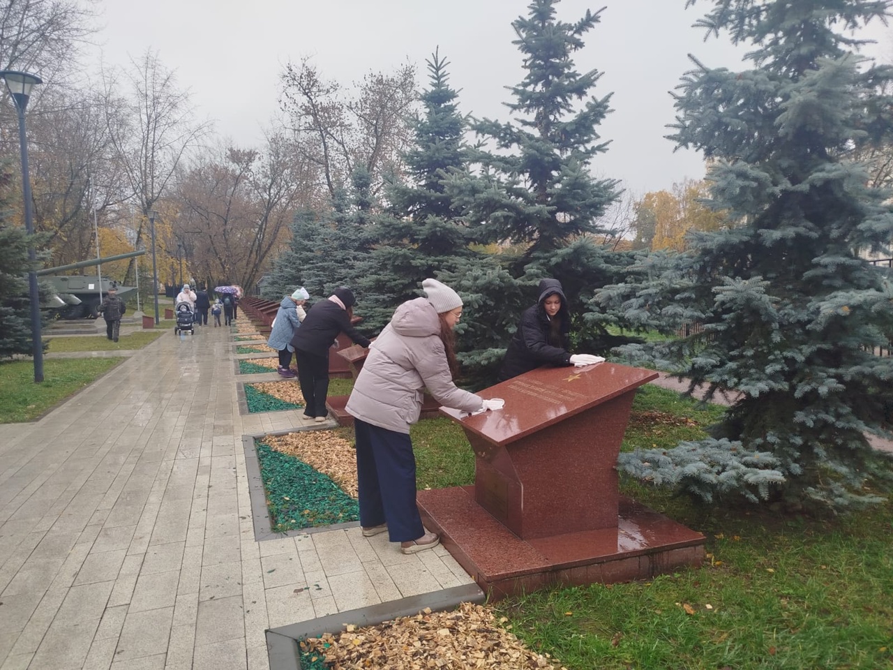 В акции приняли участие депутаты Совета депутатов муниципального округа Рязанский, учащиеся школы № 777, представители Российского Союза офицеров запаса, неравнодушные жители. Все дружно принялись за уборку парковой зоны: собрали опавшую листву, очистили музейные экспонаты от пыли.