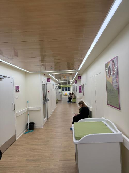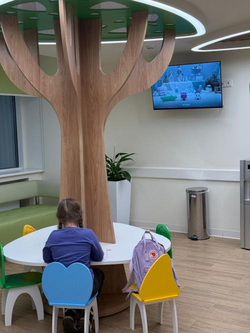 Здание на Поклонной улице практически полностью перестроили: заменили инженерные коммуникации, обновили фасад, обустроили комфортную среду для маломобильных пациентов. Теперь оно полностью соответствует новому московскому стандарту. Поликлиника оснащена всем необходимым новейшим оборудованием: от офтальмологического до систем аудиологического скрининга. Есть колясочная, комфортные зоны ожидания для самых маленьких пациентов, буфет.