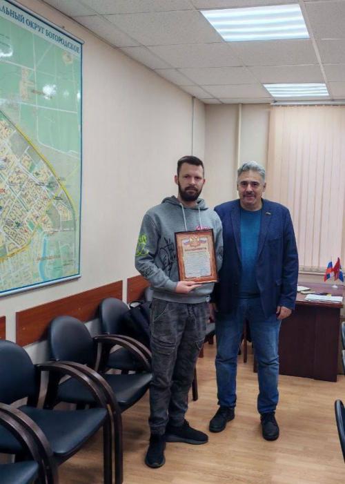 Глава муниципального округа Богородское Константин Воловик вручил благодарность за помощь в спасении человека во время пожара.