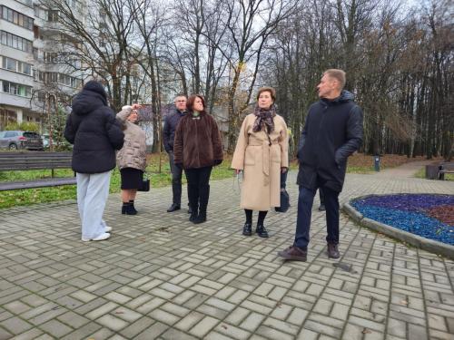 Обход стартовал с филиала № 2 библиотеки № 171 на Вильнюсской улице. Участники осмотрели состояние входных групп – это визитная карточка любого учреждения, и важно, чтобы она выглядела привлекательно и была удобной для всех жителей. Далее путь лежал через парк Малое Голубино к дому № 3 по проезду Одоевского, где идёт очистка пруда, и дома № 11-7.