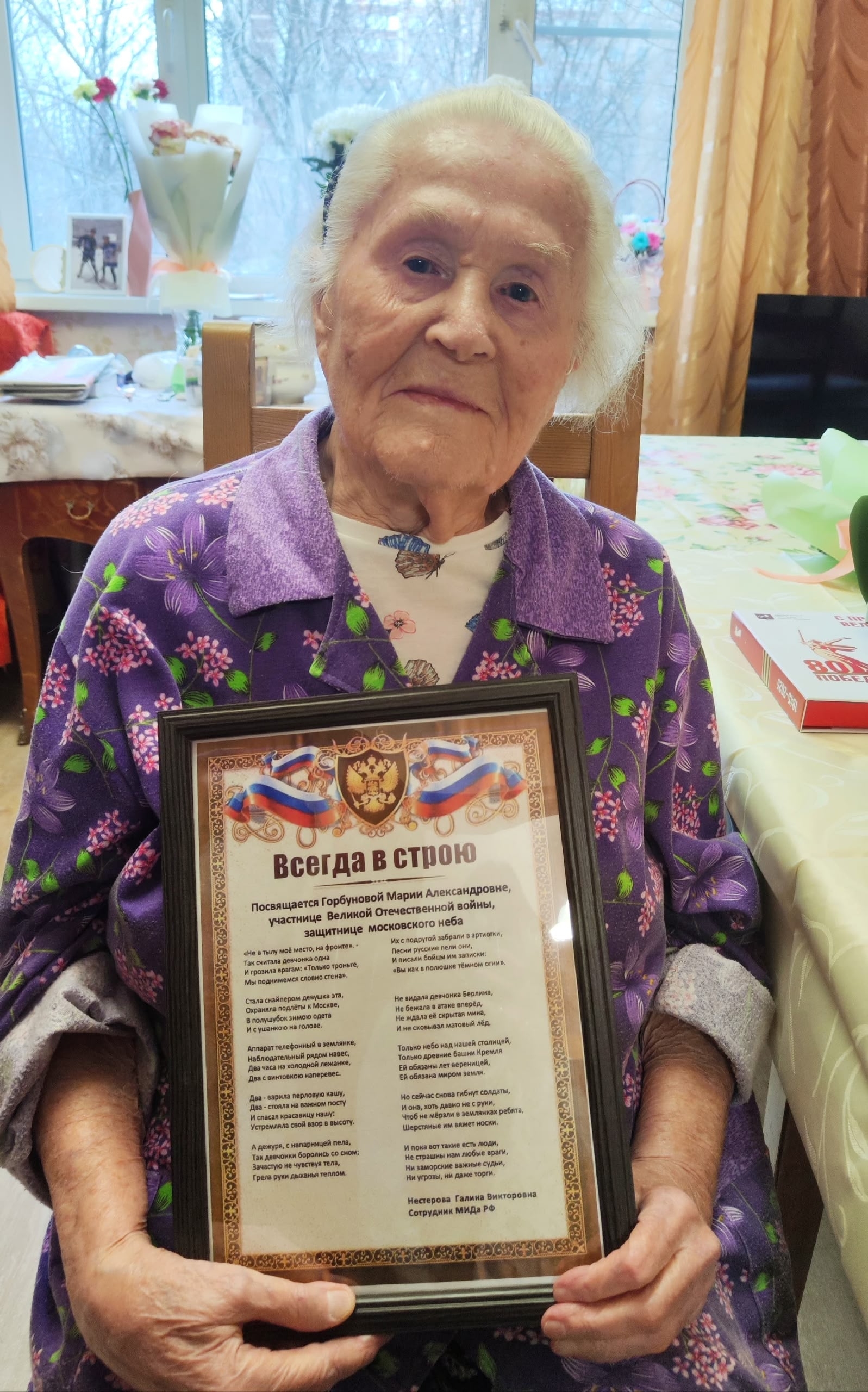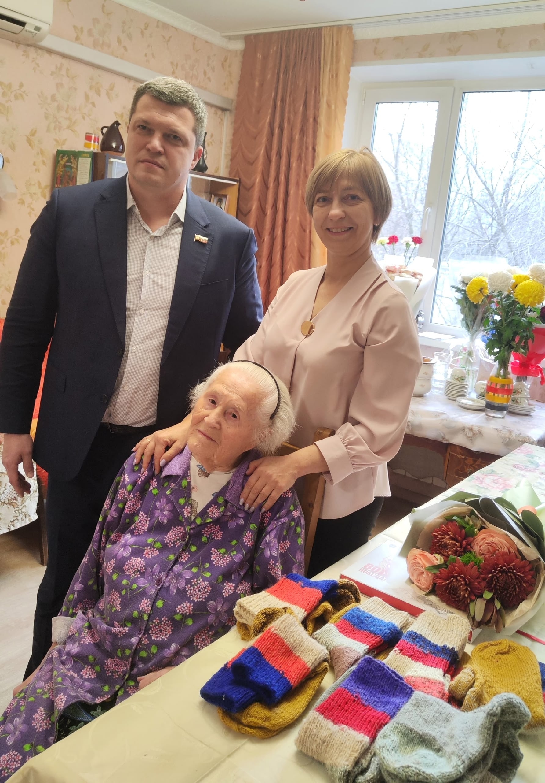 От лица органов местного самоуправления депутаты пожелали почётному жителю муниципального округа крепкого здоровья, жизненных сил и энергии на долгие годы. Ветеран поделилась секретами долголетия и историями жизни своей семьи. Также Мария Александровна передала очередную партию связанных ею шерстяных носков для бойцов специальной военной операции и отметила важность гуманитарных поездок на линию фронта.