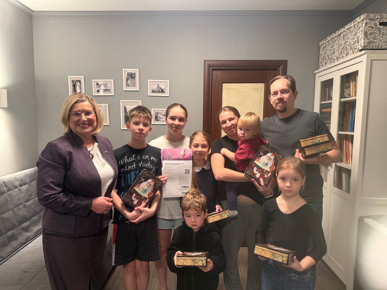 «Очень тронуло знакомство с многодетной семьей, в которой растут девять детей. Кто-то уже ходит в институт, кто-то учится в школе. Каждый ребёнок развитый, общительный, вежливый – невероятно тёплое ощущение от встречи. В доме – уют и чистота. И несмотря на то, что квартира небольшая, у каждого ребёнка есть свой любимый уголок для занятий и личных дел. Вручили сладкие подарки и билеты на новогоднее представление «Сны Пушкина». Пусть Новый год подарит этой семье здоровье, тепло, спокойствие», – отметила Любовь Абдулина.