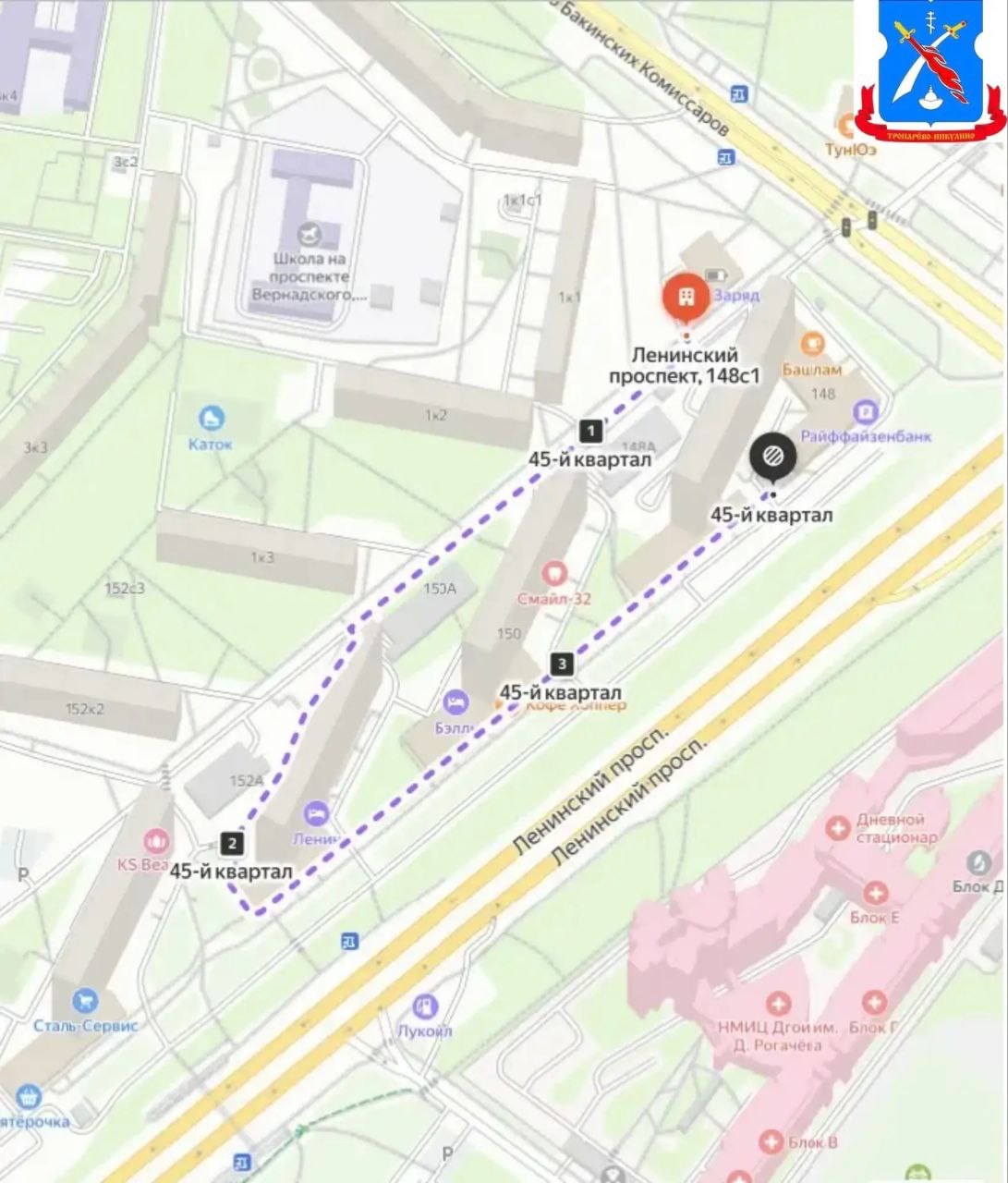 Участники прошли по территории по маршруту: Ленинский пр-т, д. 148, стр. 1 и далее по схеме. Завершился маршрут у дома № 148 на Ленинском проспекте. По итогам обхода поставлены задачи рассмотреть возможность обустройства лестничного спуска (первый подъезд дома № 150 на Ленинском проспекте) и проработать вопрос организации лестницы между домами № 152 и 150 на Ленинском проспекте.