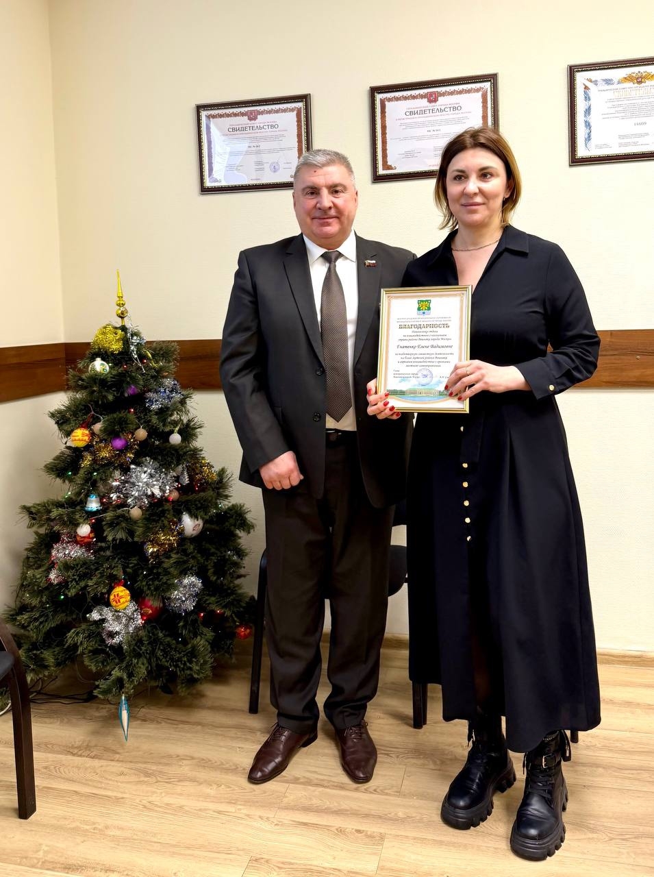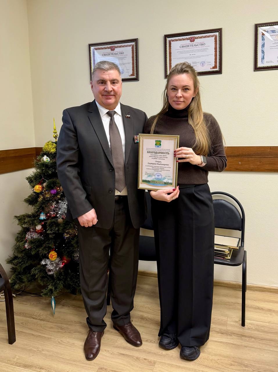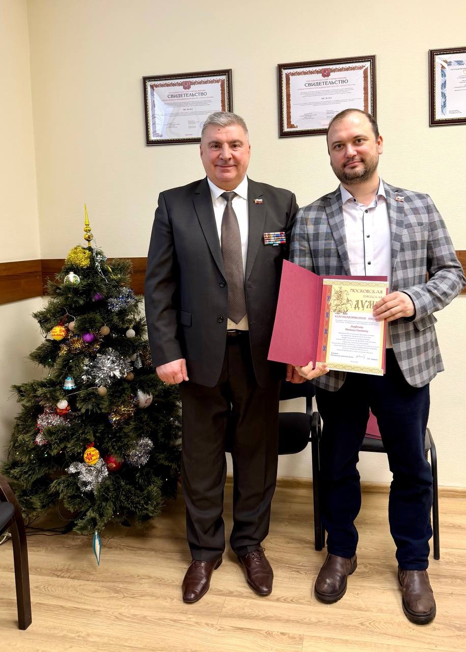 Андрей Савидов торжественно вручил благодарственные письма Московской городской Думы за вклад в реализацию социально-значимых проектов Восточного округа депутатам Даниилу Агафонову, Екатерине Мальцевой и председателю Правления РООИКС Михаилу Руеву.