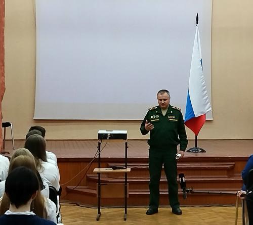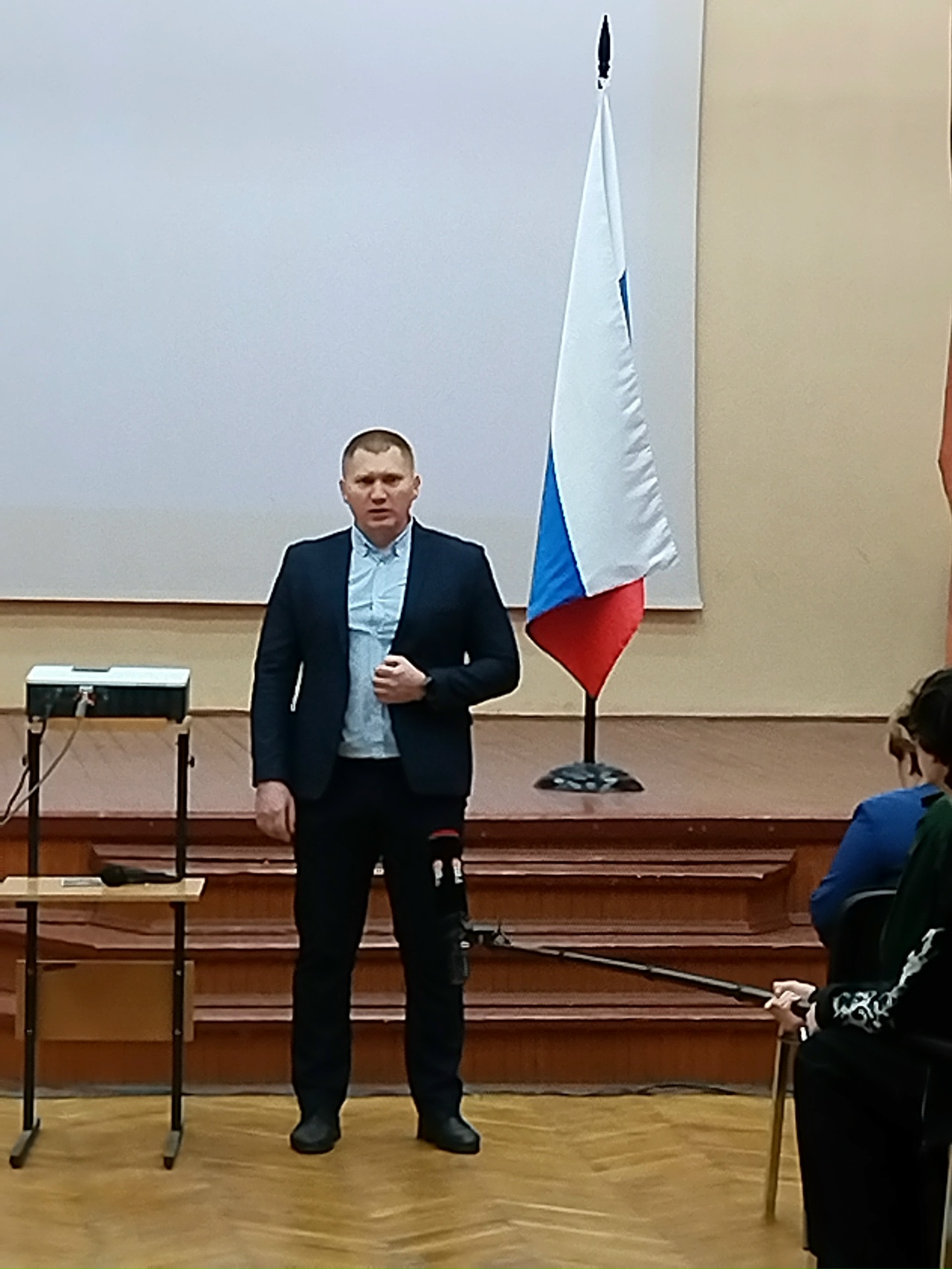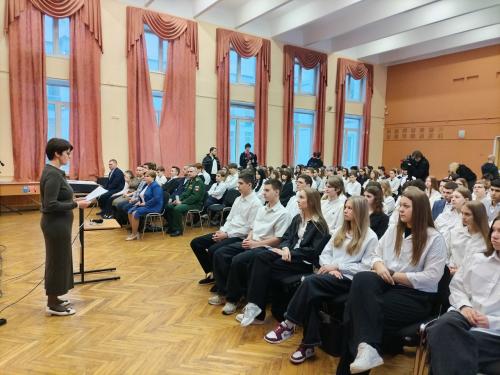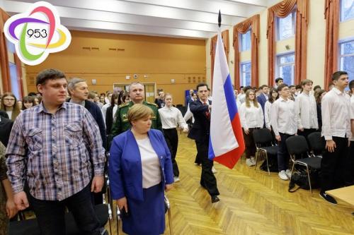 Глава муниципального округа Бибирево Александр Аршанский вместе с представителем военного комиссариата СВАО, полковником Дмитрием Карамышевым и директором школы Оксаной Волощенко в качестве почётных гостей приняли участие в занятии из цикла «Разговоры о важном», которое прошло в школе № 953 для учеников старших классов.