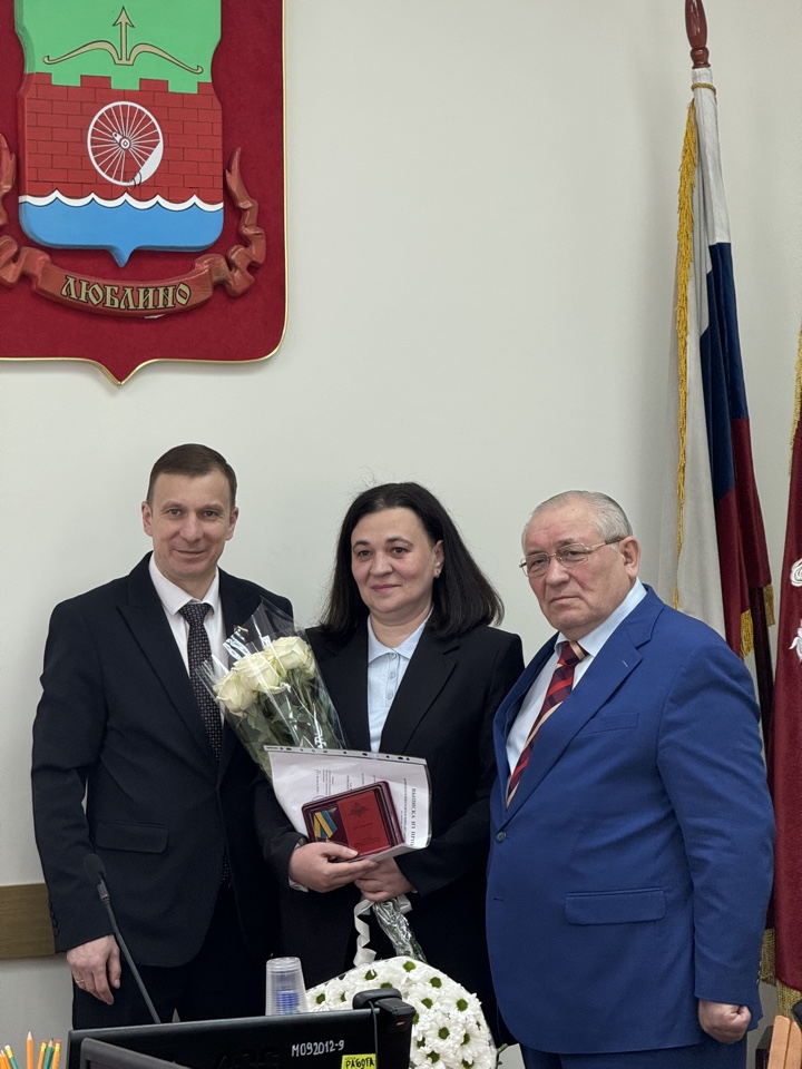 Началось заседание с чествования. Глава муниципального округа Люблино Руслан Багаутдинов совместно с главой управы Алексеем Бирюковым вручили медаль «Генерал армии Маргелов» Марине Фатеевой за заслуги, проявленные при содействии в решении задач, возложенных на Воздушно-десантные войска.
