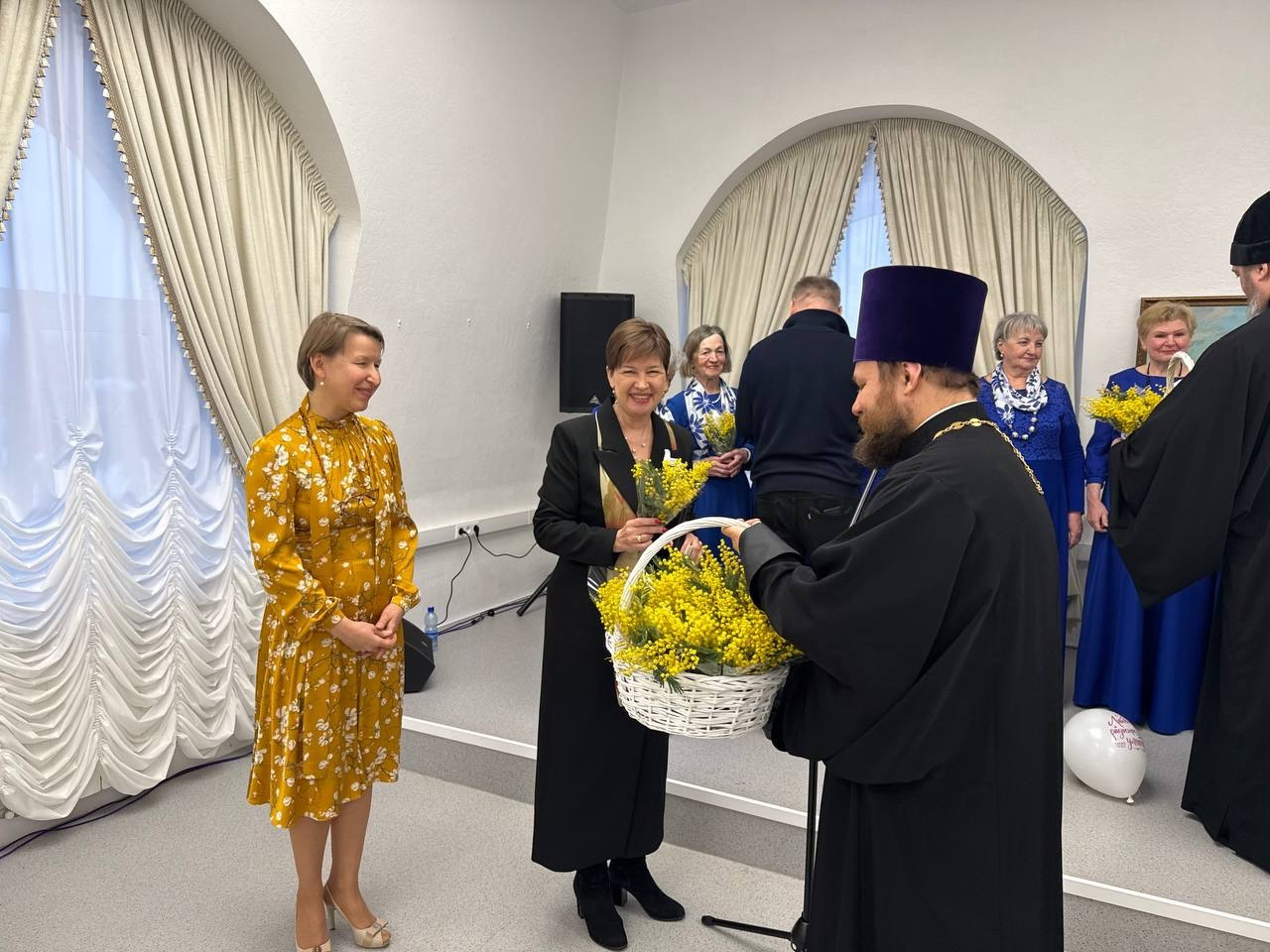 В завершение концерта мужчины вручили всем женщинам веточки мимозы как символ весны и надежды, а иерей Игорь Константинов пригласил гостей на чай с пирожками.