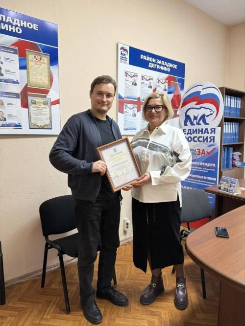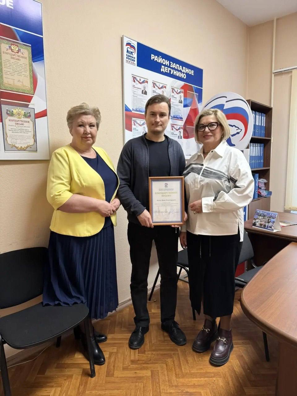 Также в рамках встречи было вручено благодарственное письмо от исполнительного секретаря местного отделения партии по САО Эльдара Шарипова.