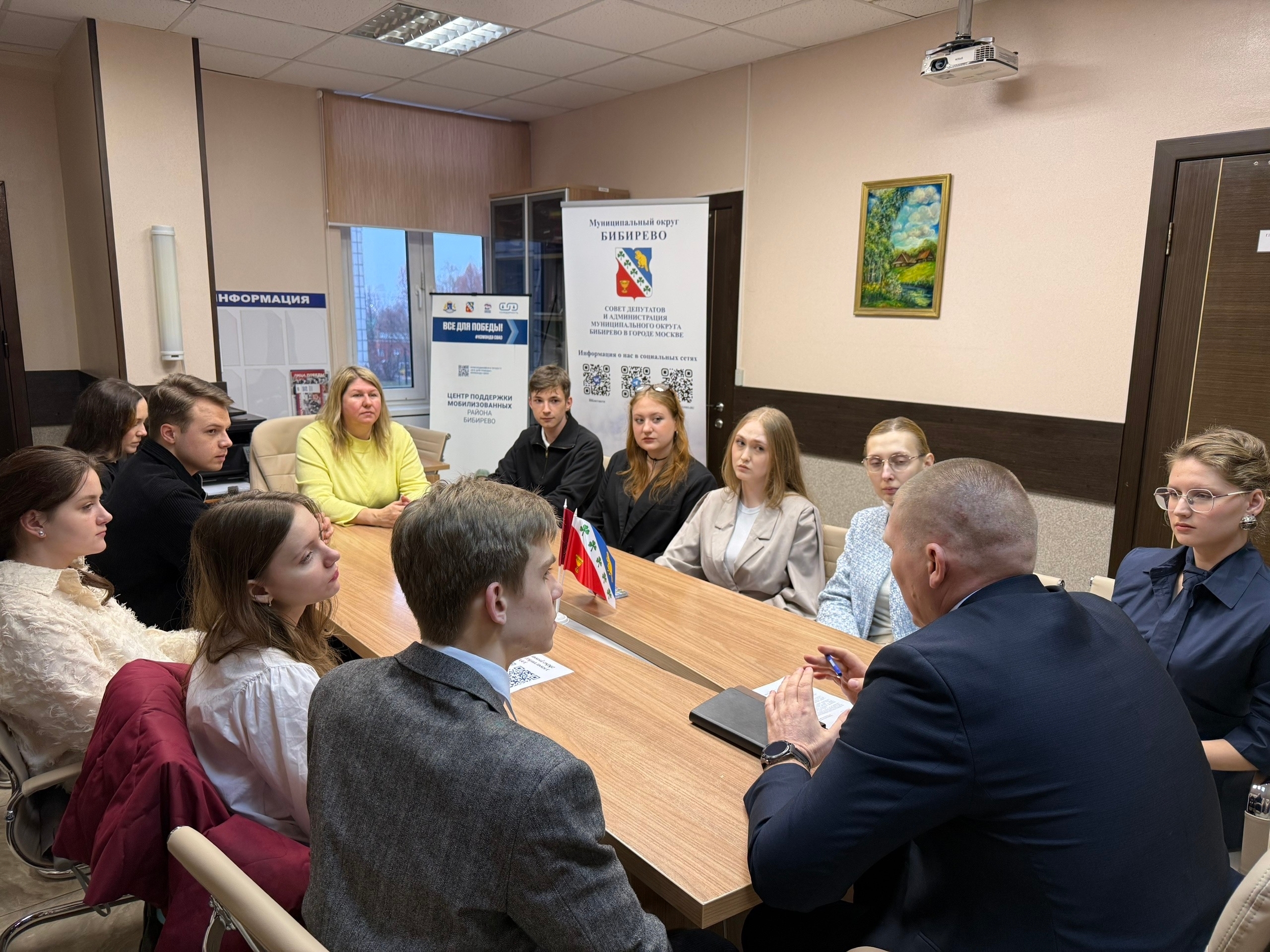 Глава муниципального округа Бибирево Александр Аршанский 6 апреля провёл встречу с членами районной молодёжной палаты. Также во встрече приняла участие заместитель главы управы по работе с населением Анна Харламова.
