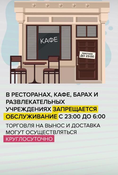 - В заведениях общественного питания (ресторанах, кафе, барах) а также в ночных клубах, караоке, боулингах, на дискотеках и в других развлекательных заведениях запрещается обслуживание посетителей в ночное время – с 23.00 до 6.00. Вводимые ограничения не распространяются на торговлю на вынос и курьерскую доставку готовых блюд, которые по-прежнему могут осуществляться круглосуточно.